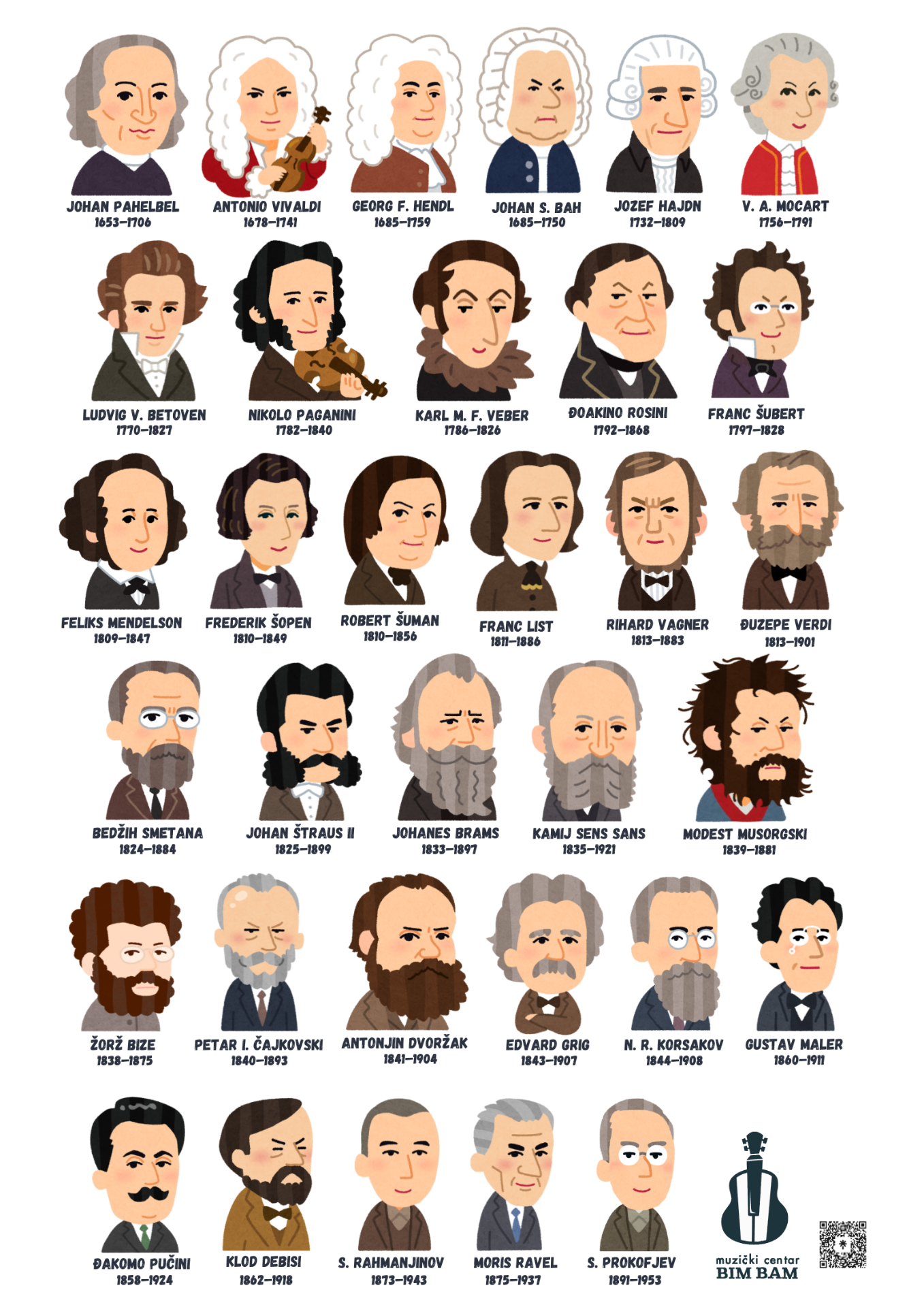 Slike najvažnijih kompozitora od Pahelbela do Prokofjeva, sa godinama rođenja i smrti. Zanimljive ilustracije pomoći će vam za lakše pamćenje i hronologiju, razumijevanje odnosa i vremena kada su živjeli. Nakon uplate , na mejl ćete u najkraćem roku dobiti poster u elektronskom formatu. Posteri se mogu štampati u formatima od A1 do A5.