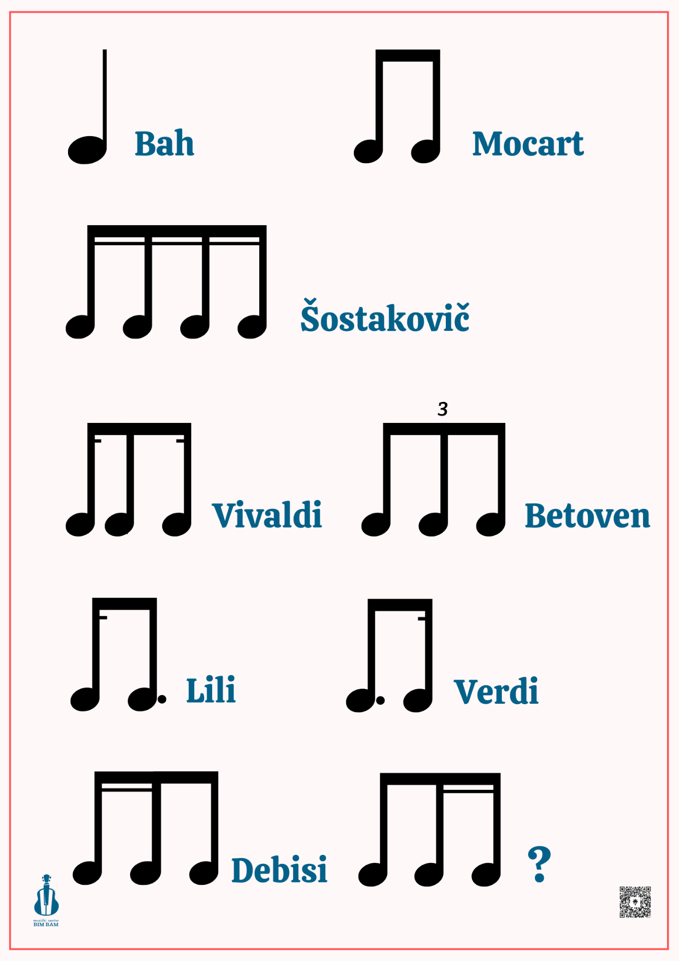 Poster za muzičku školu, sa šaljivim prikazom imena kompozitora kroz ritmičke figure. Može poslužiti i za igru i za provjeru znanja. Nakon uplate , na mejl ćete u najkraćem roku dobiti poster u elektronskom formatu. Posteri se mogu štampati u formatima od A1 do A5.