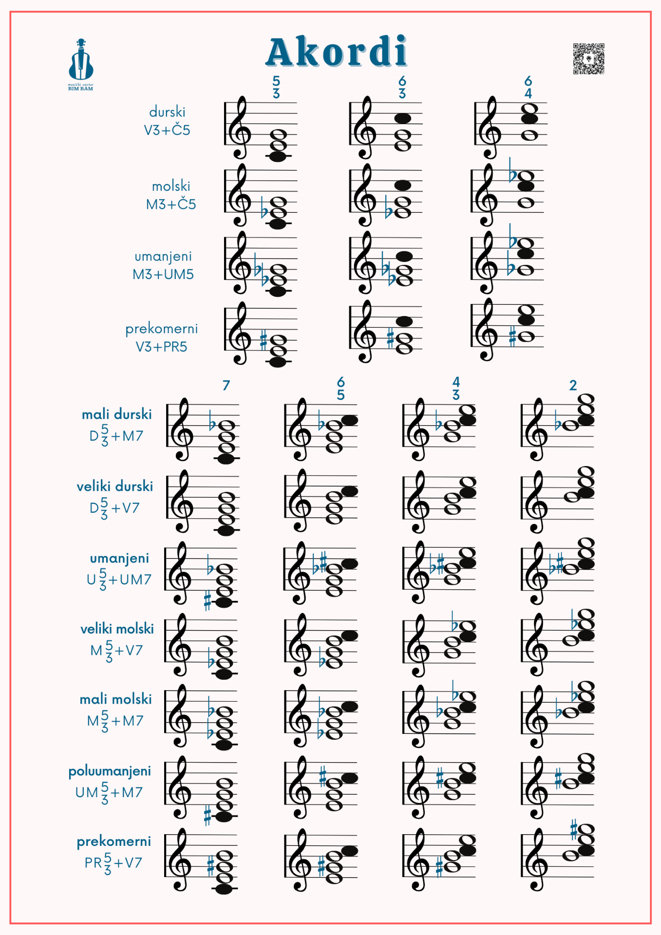 Pregled molskih i durskih trozvuka i četvorozvuka, sa obrtajima. 4 osnovna trozvuka i 7 četvorozvuka sa prikazom kako se koji akord gradi, u notnom sistemu. Nakon uplate , na mejl ćete u najkraćem roku dobiti poster u elektronskom formatu. Posteri se mogu štampati u formatima od A1 do A5.