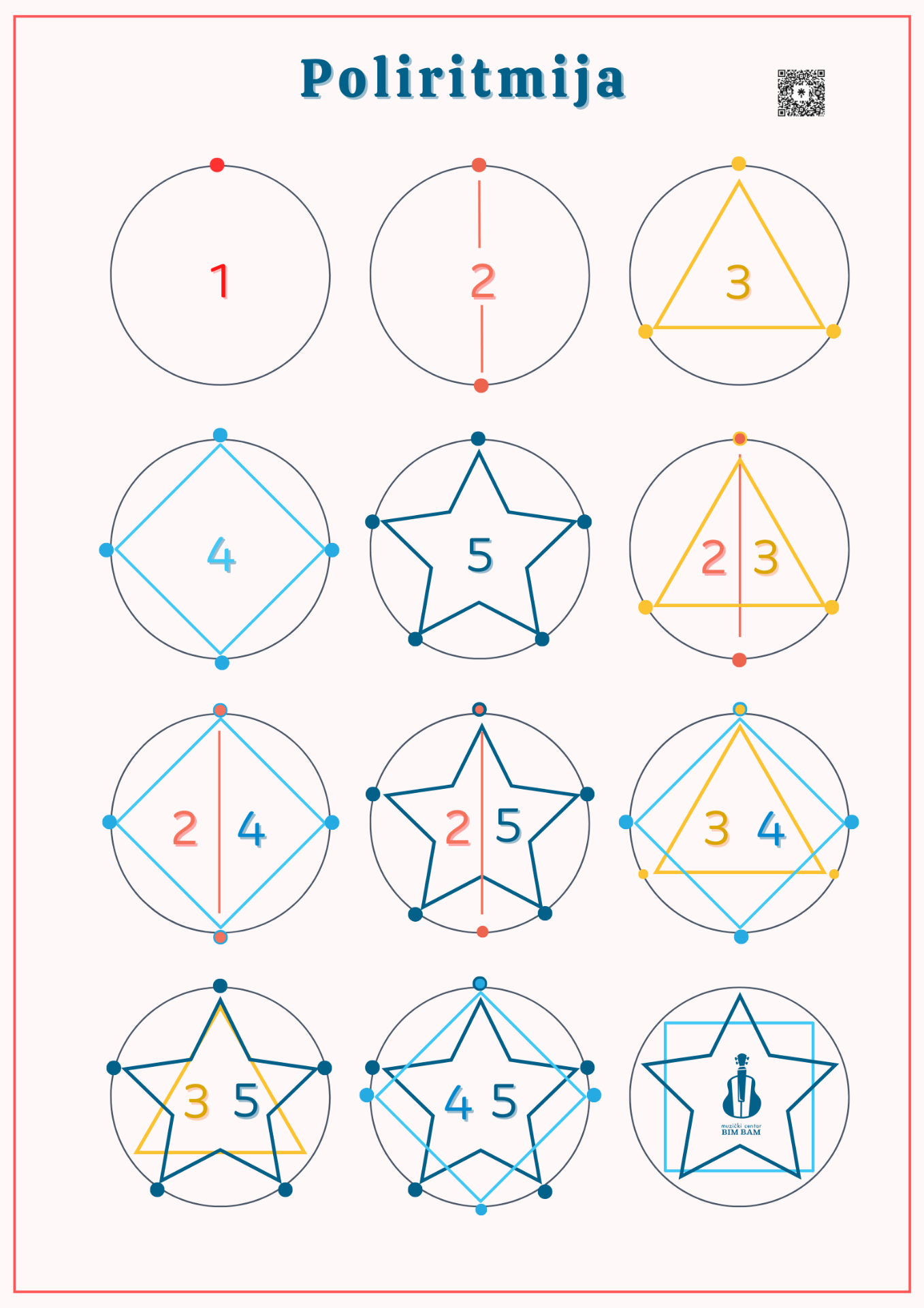 Jednostavan, slikovit prikaz poliritmičnih obrazaca, za lakše razumijevanje podjela. Pomoć u svakoj učionici za učenje, provjeru znanja i igru. Nakon uplate , na mejl ćete u najkraćem roku dobiti poster u elektronskom formatu. Posteri se mogu štampati u formatima od A1 do A5.